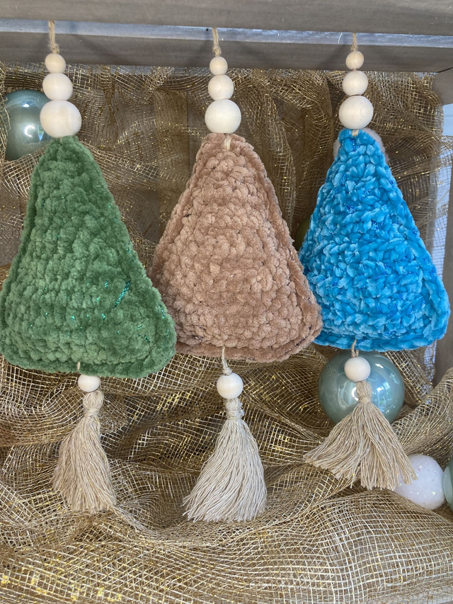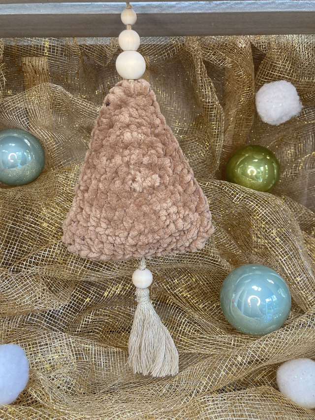 Une jolie décoration faite main, en laine ornée de perles en bois et d'un pompon. Sapin ou simple forme géométrique, c'est selon vos goûts!!