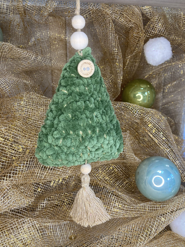 Sapin: Laine chenille (acrylique) et fil lurex or