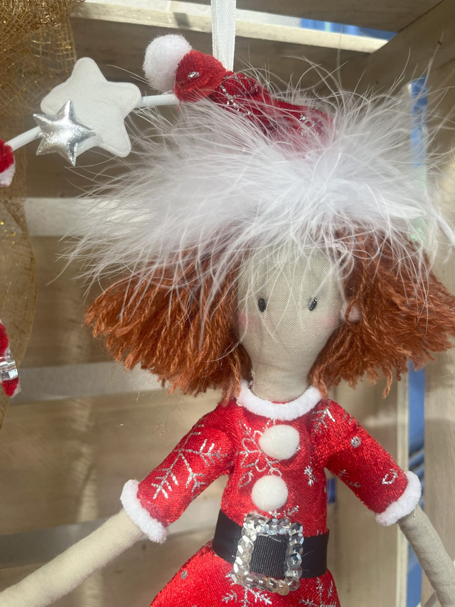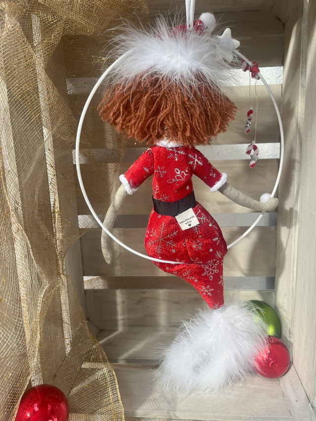 Composition: Corps/ Queue/ Bonnet : Tissu coton beige/ velours rouge / Nageoires/ Bonnet : Marabout blanc / Ceinture : Gros grain et paillettes argent / Pompons : Polyester / Cheveux : Laine acrylique / Cerceau : Métal galvanisé blanc, diamètre 25 cm / Rembourrage : Polyester /